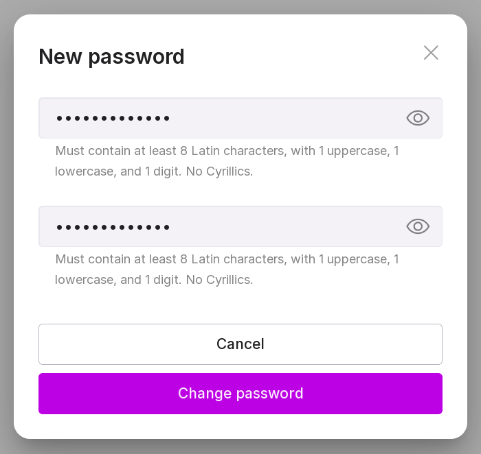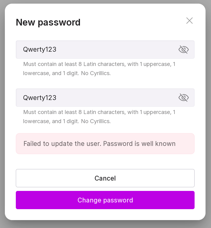 The password must consist of at least 8 characters. The password must consist of Latin letters (A-z) and Arabic numerals (0-9). The alphabetical part of the password must contain both lowercase and uppercase letters. * the password should not contain simple combinations, commonly known abbreviations, or consecutive characters. If the requirements are not met, an error will appear when saving the password.