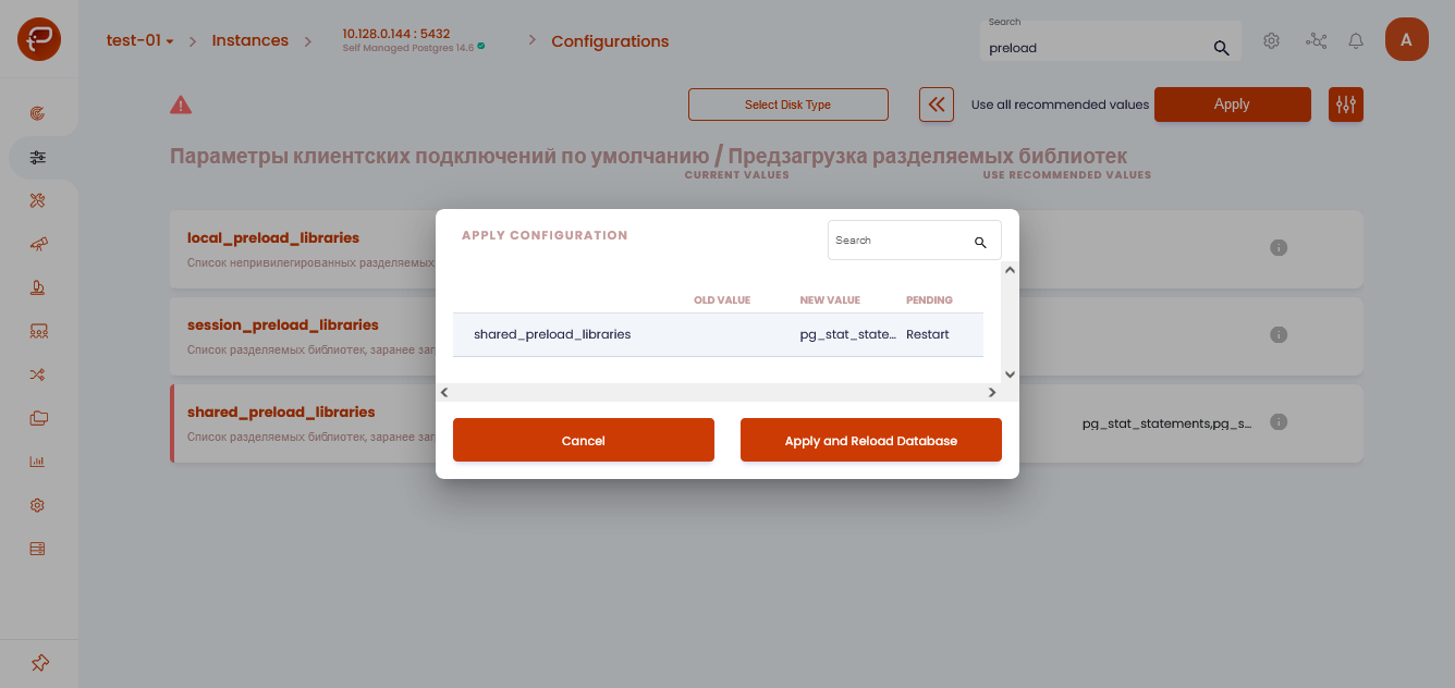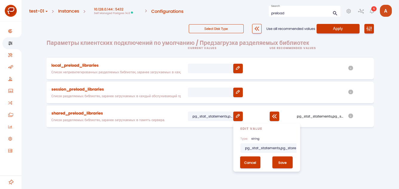 In the “Client Connection Defaults / Shared Library Preloading” section (Client Connection Defaults / Shared Library Preloading), set the recommended values in the variable string shared_preload_libraries: pg_stat_statements, pg_store_plans, auto_explain