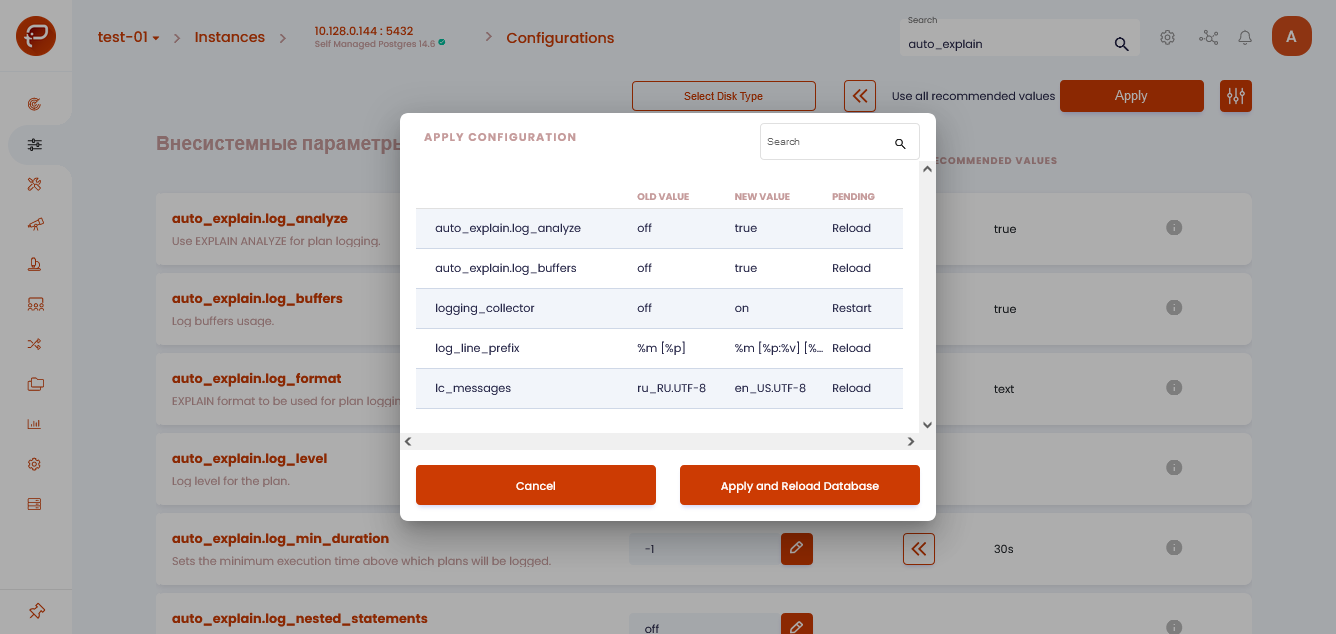 \# Settings for Advanced analytics logging_collector = on log_line_prefix = '%m \[%p:%v] \[%d] %r %a ' log_lock_waits = on lc_messages = 'en_US.UTF-8' auto_explain.log_analyze = on auto_explain.log_buffers = on track_io_timing = on auto_explain.log_nested_statements = 'true' # set an appropriate value deadlock_timeout = 1000ms log_min_duration_statement = 10s pg_store_plans.min_duration = 10s auto_explain.log_min_duration = 10s # Mandatory condition log_filename = 'postgresql-%F.log' # required at a minimum for collecting logs from Advanced Analytics log_destination = 'stderr' # minimum none to show errors log_statement = 'none' # For PostgresPro type DBMS, specify pgpro_stats instead of 'pg_store_plans' shared_preload_libraries = 'pg_stat_statements, pg_store_plans, auto_explain' # Settings for Advanced analytics end