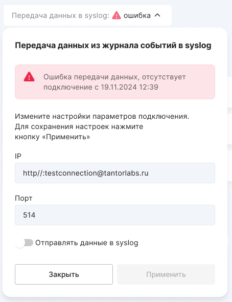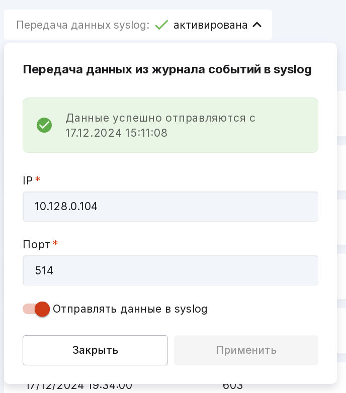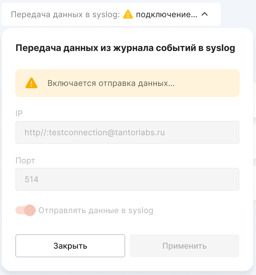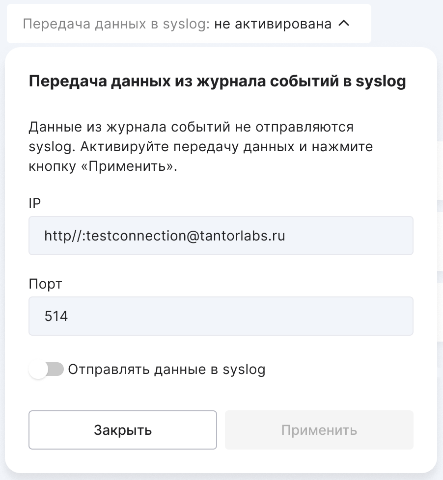 “Not activated” — the “IP” and “Port” fields are filled in, but the toggle “Send data to syslog” is in the left position. To start the transfer, switch it to the right position;