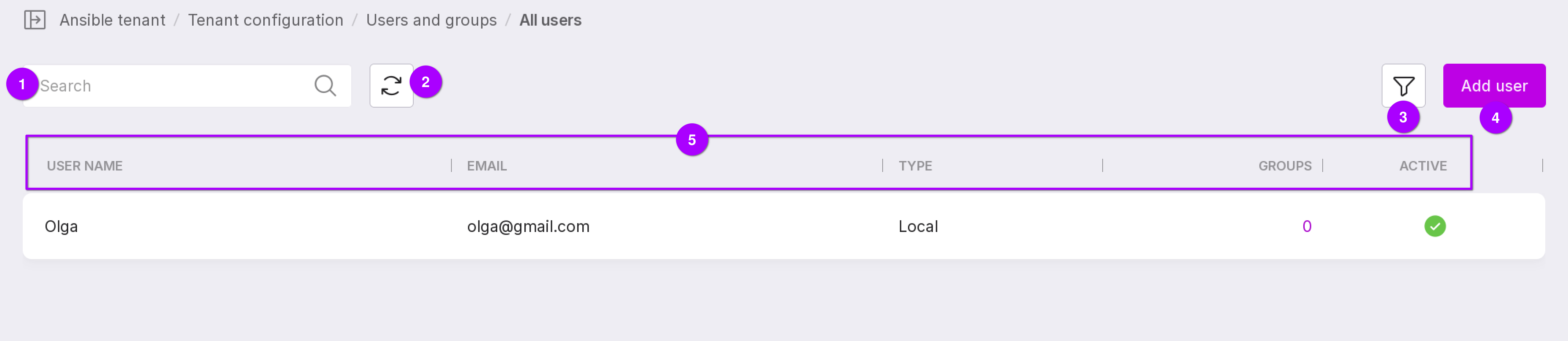 A search bar that allows to search for users by name and email. Page refresh button. Filter by user type: external or local. Button to add a new user. User information: