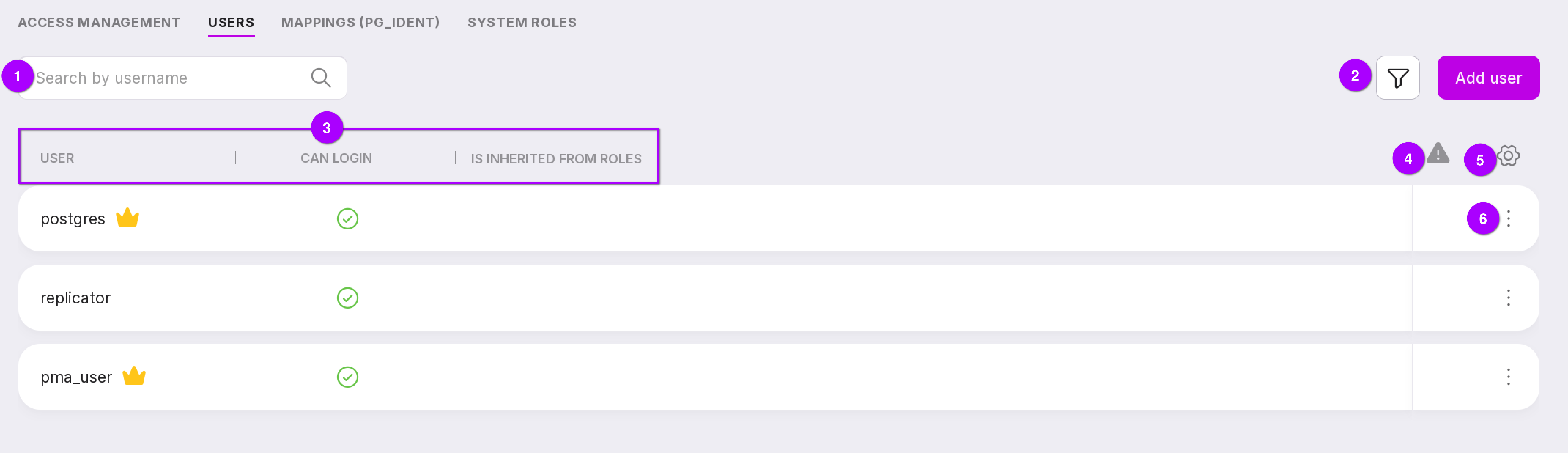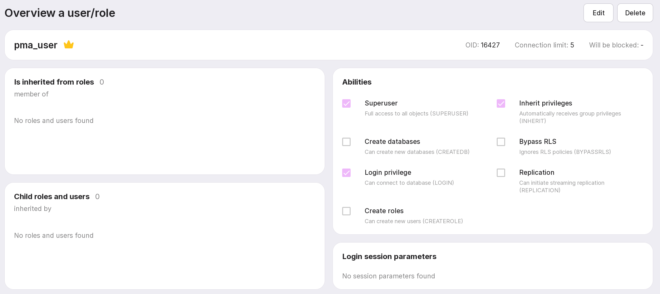 “Is inherited from roles”: shows the roles from which the current role inherits privileges. A crown icon denotes a superuser; an “S” denotes a system user.