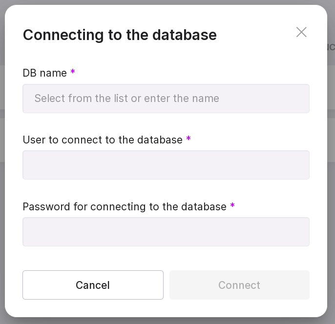 “DB Browser” — opens the connection window to the database. Detailed information on the page can be found here DB Browser. This module requires an additional license. In the opened window, enter the database name, username, and password.