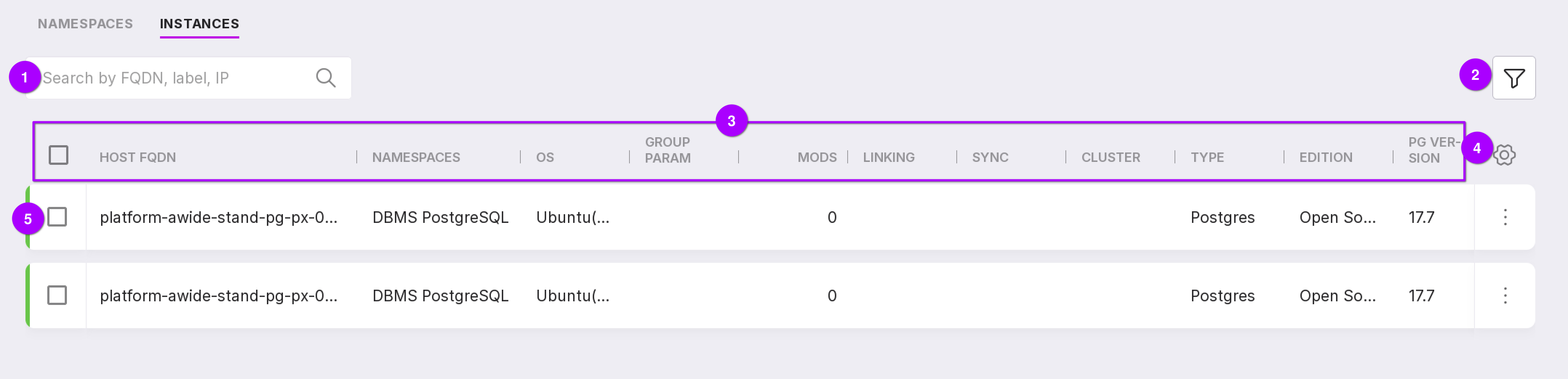 Using the search bar, you can find the required instance by node name, label, or IP. The filter allows instances to be filtered by the following parameters: