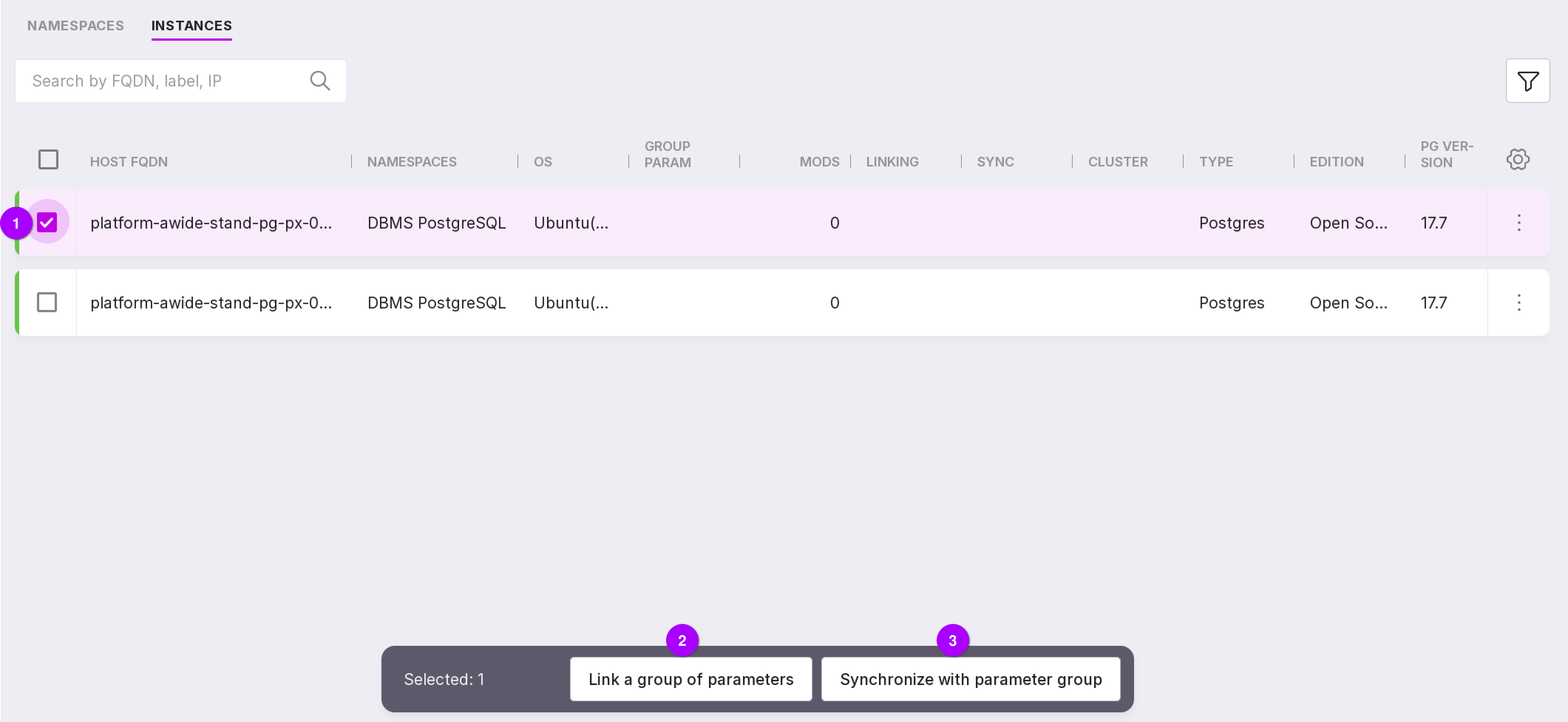 By checking the checkbox on the left (number 1 in the picture below), you can link the instance to parameter group (number 2 in the picture below) or synchronize it with the param group (number 3 in the picture below).