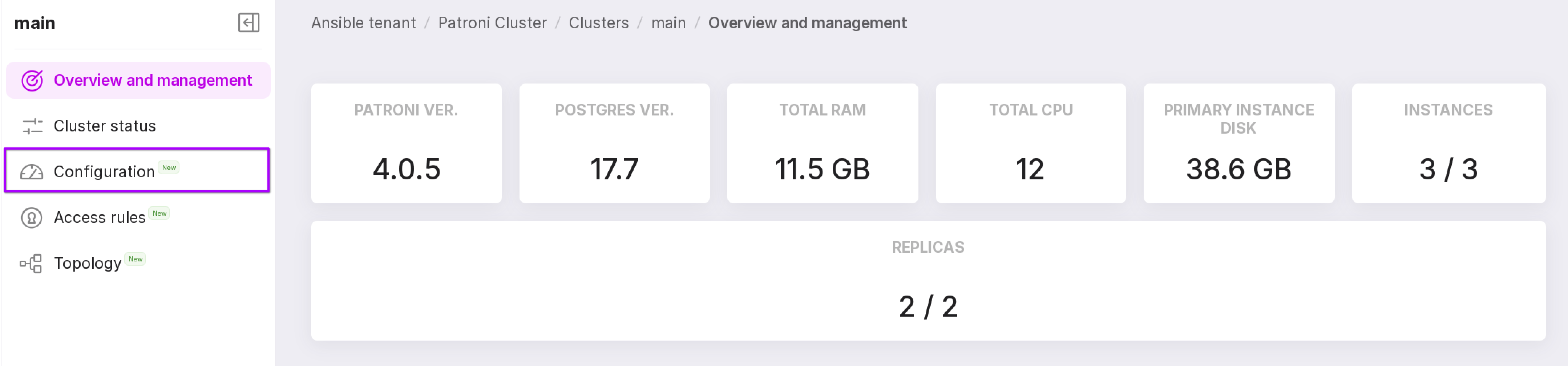 Go to the “Clusters” tab in the namespace and click on the row of the required cluster. On the opened page, click “Configuration” in the left menu.