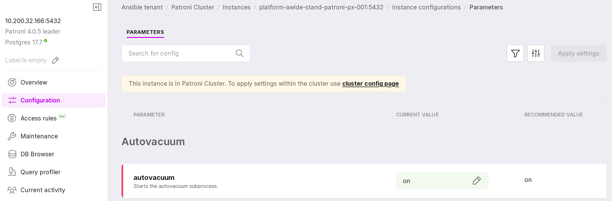 Go to the “Configuration” tab of the cluster instance from the side menu. At the top of the opened page, follow the link “cluster config page.”