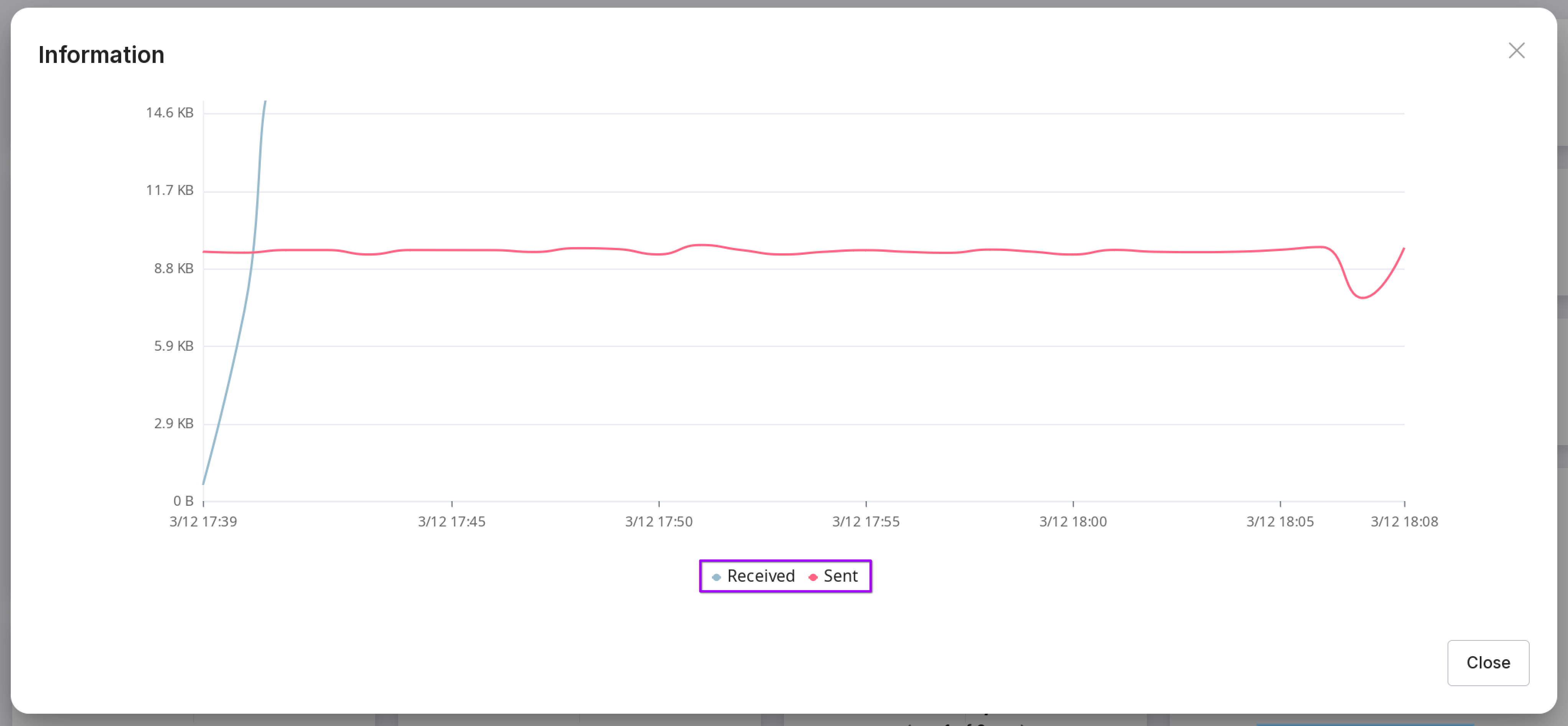 The popout window displays information on received and sent data.