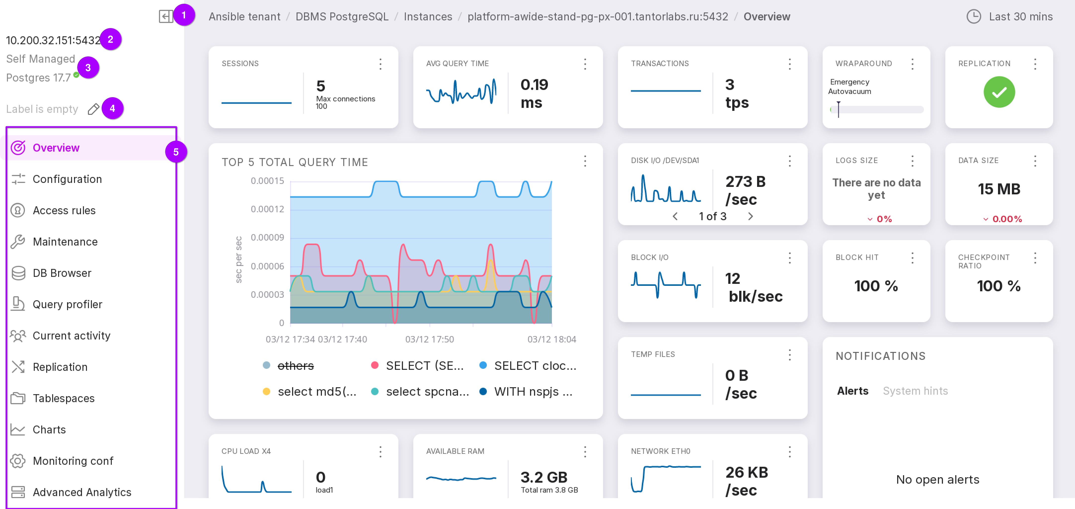 The “Overview” page displays tiles containing the performance indicators of Platform, DBMS, and related system hardware.