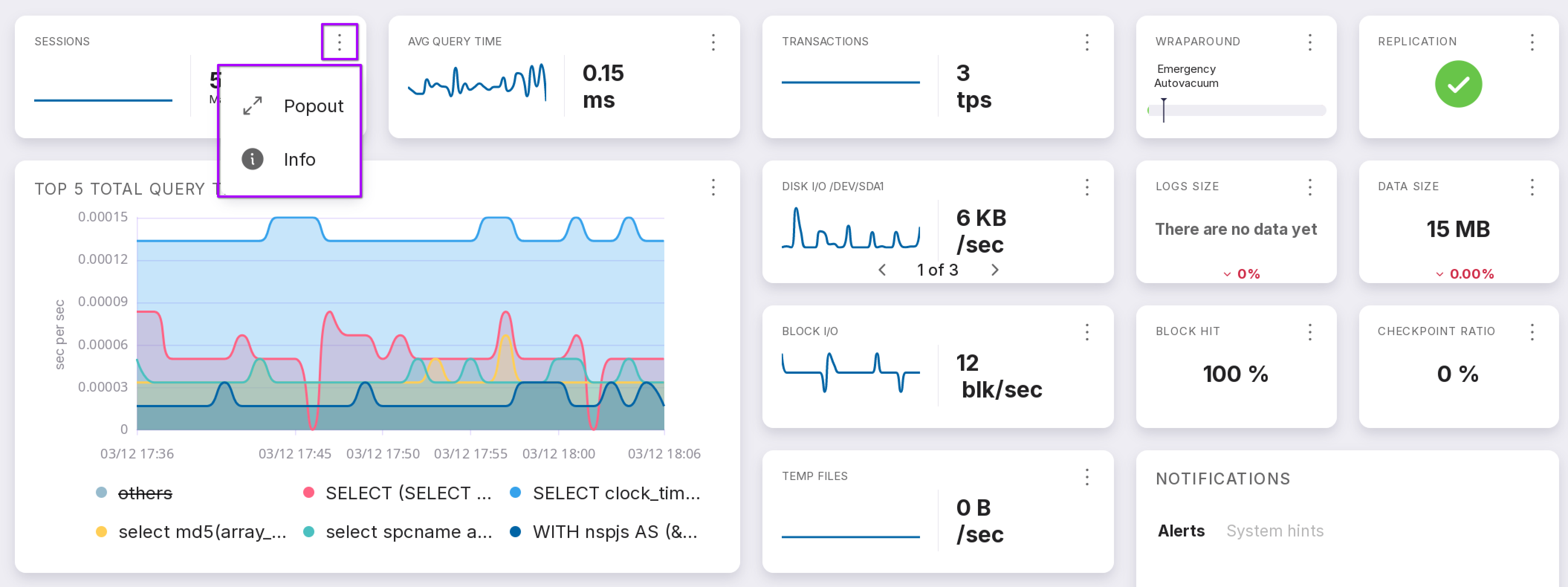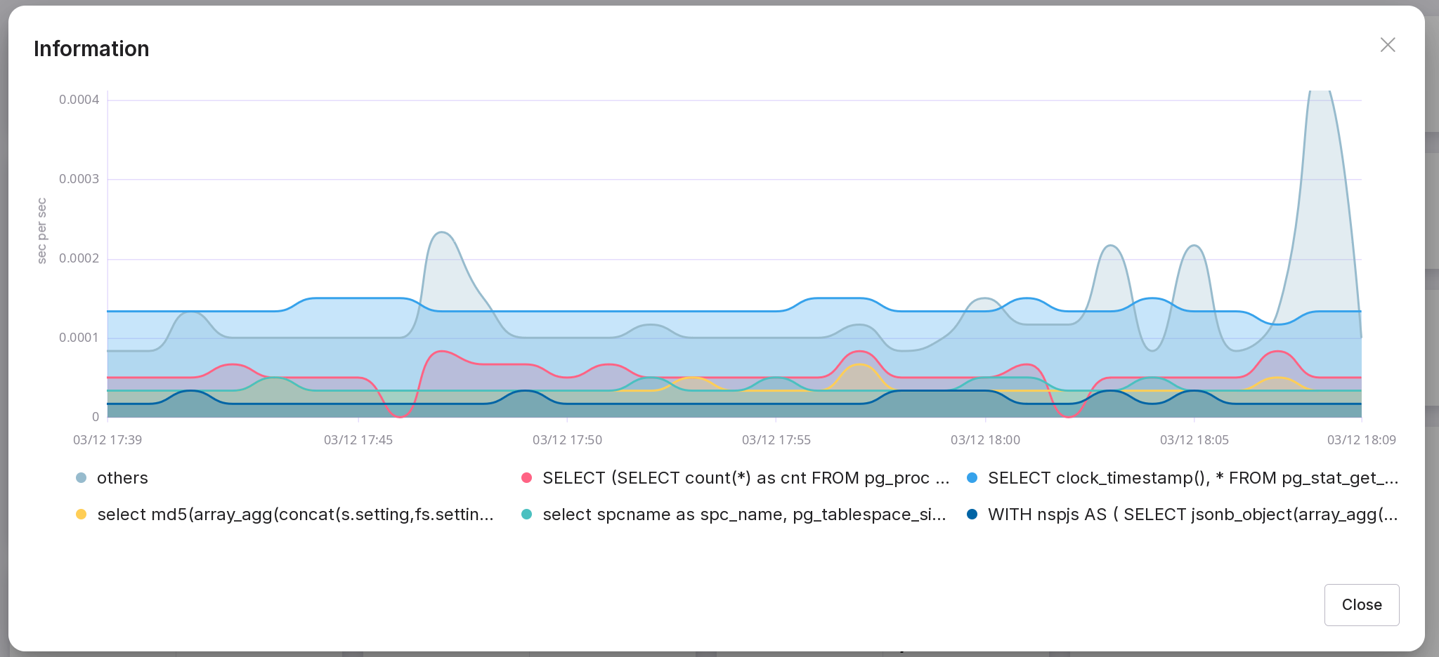 The chart displays aggregated data of the five longest queries for the last specified period of time. The Y-axis measures time in seconds per second. Queries not in the top 5 are aggregated into the “others” slot. To display them, click on the chart. You can hide and show metrics by clicking on them.