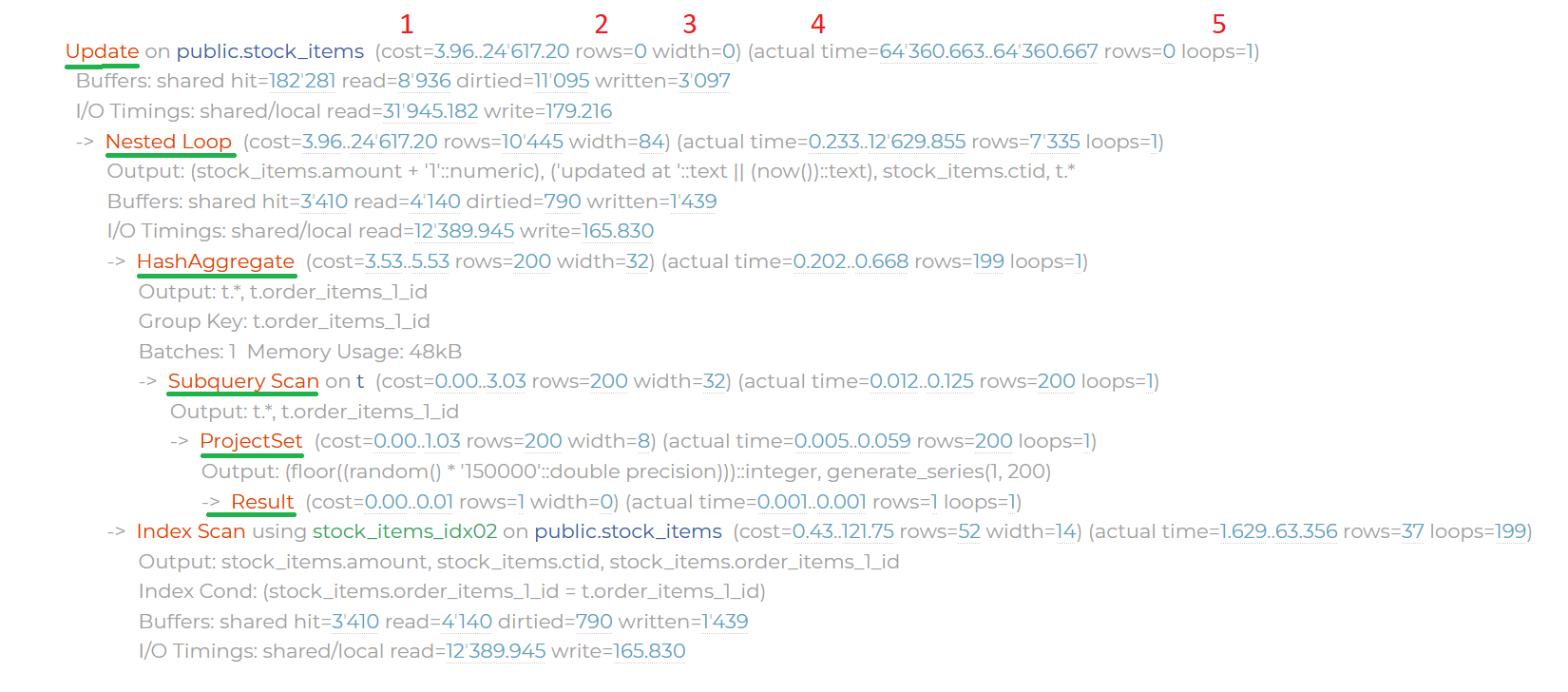 In general terms, the result of executing such a command returns the names of the nodes (underlined in green in the figure below) of the written query and the “cost” of each such query (cost, indicated by the number 1 in the figure below). Accordingly, the plan that has smaller cost wins. The cost is returned depending on the given parameters, which can be: cost per atomic operation in terms of CPU, cost of retrieving one record, etc. The following metrics are also returned (all provided on a per-node basis):