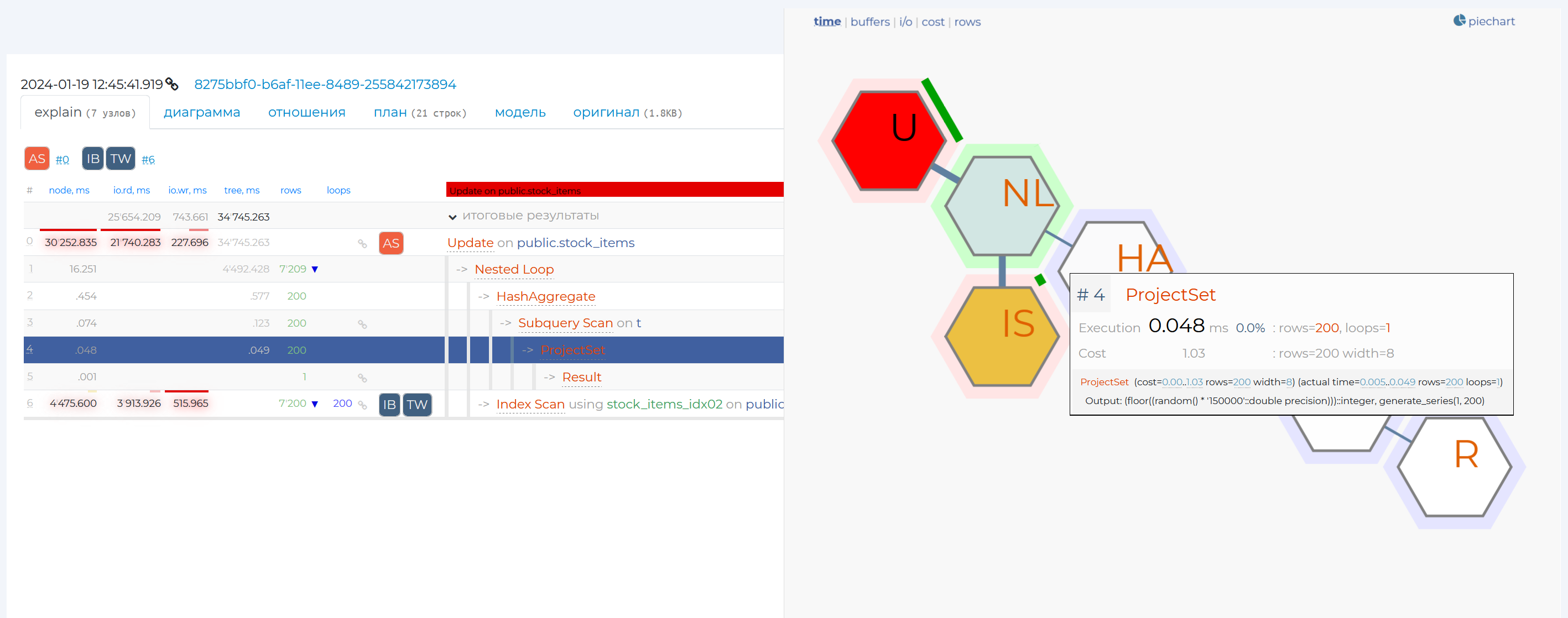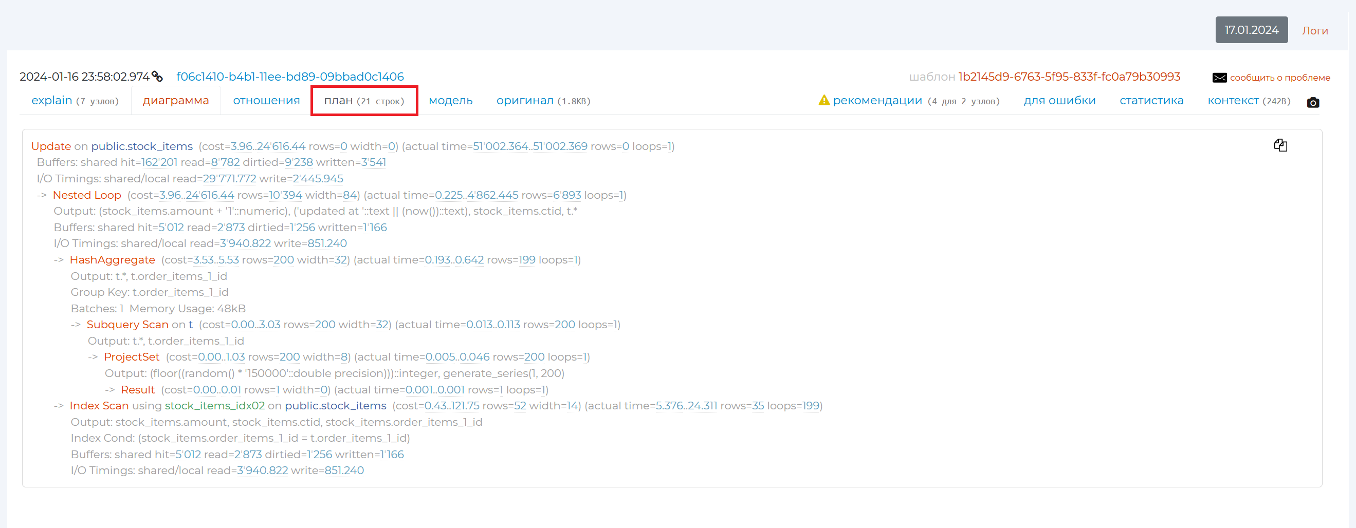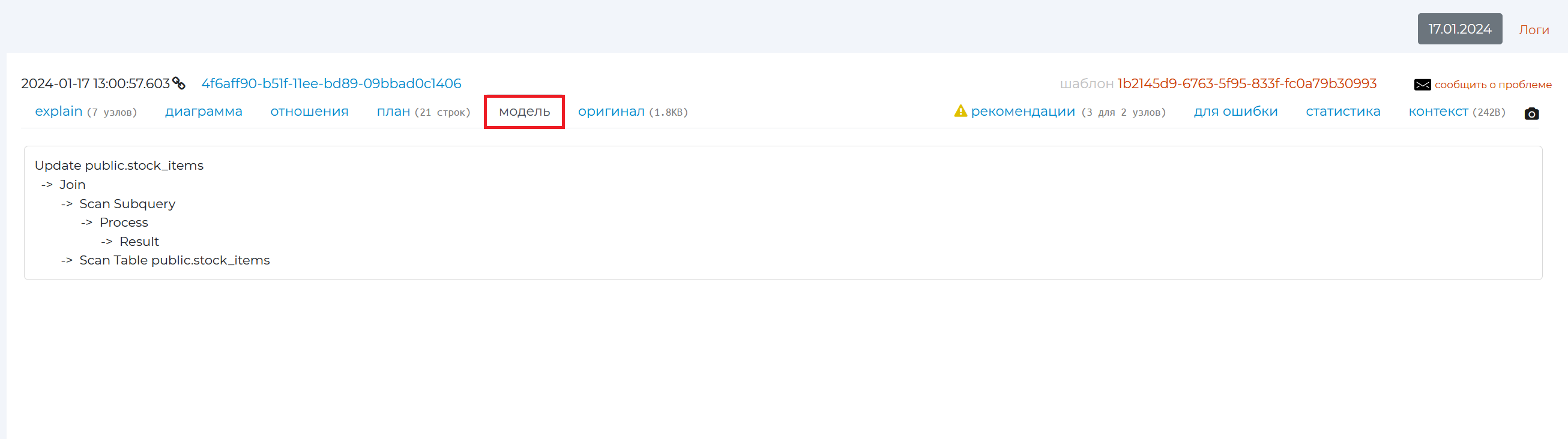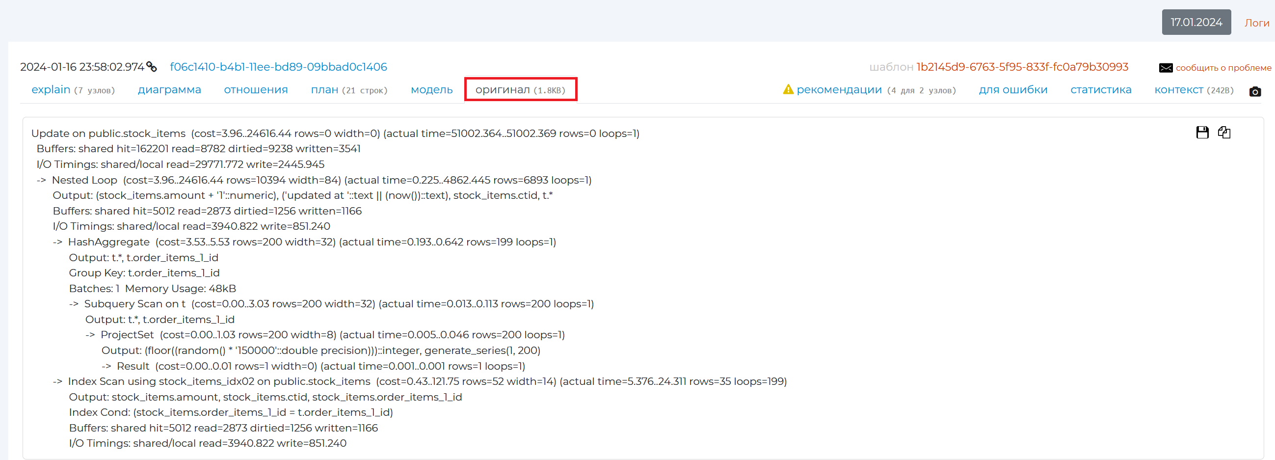 The “Plan” tab contains the same plan as the “original” tab, only in a more visual form: overloading punctuation marks can disappear, the names of each plan node are highlighted.