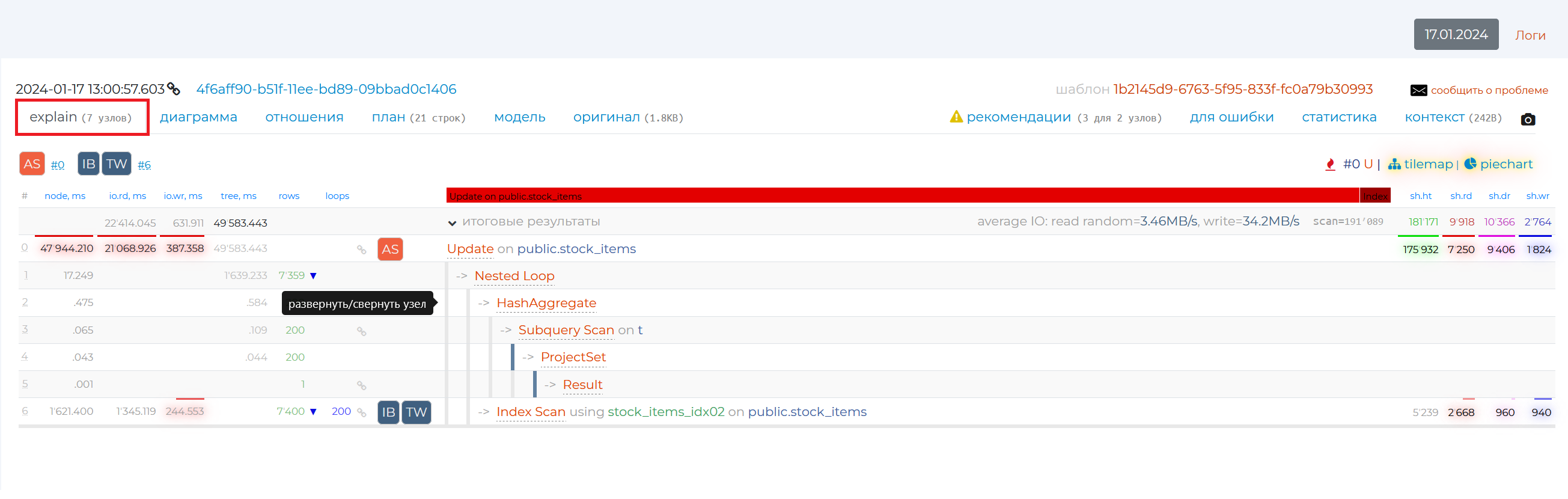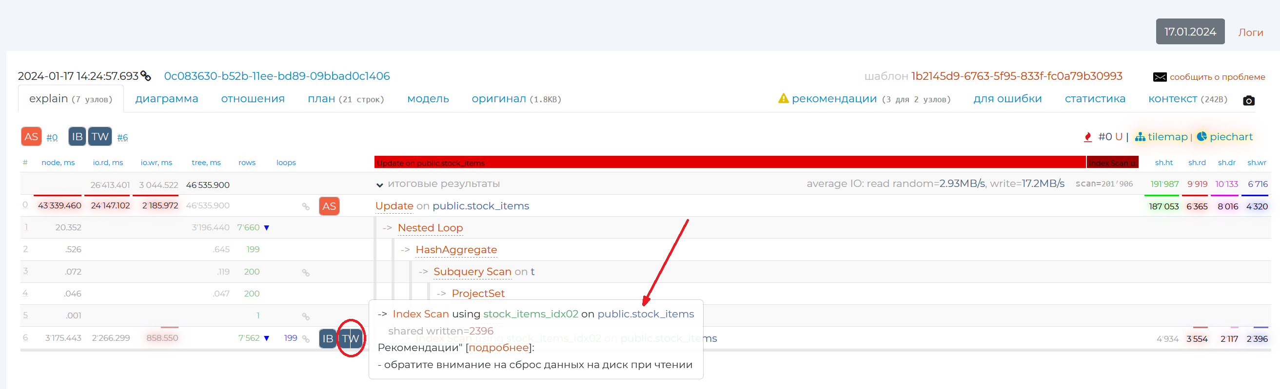 io.wr, ms — result of the explain attribute “track_io_timing”, the time in milliseconds that was spent to write data to the disc. As for the previous column, hovering the mouse cursor over the value of this column will display a tooltip with the speed of this operation.