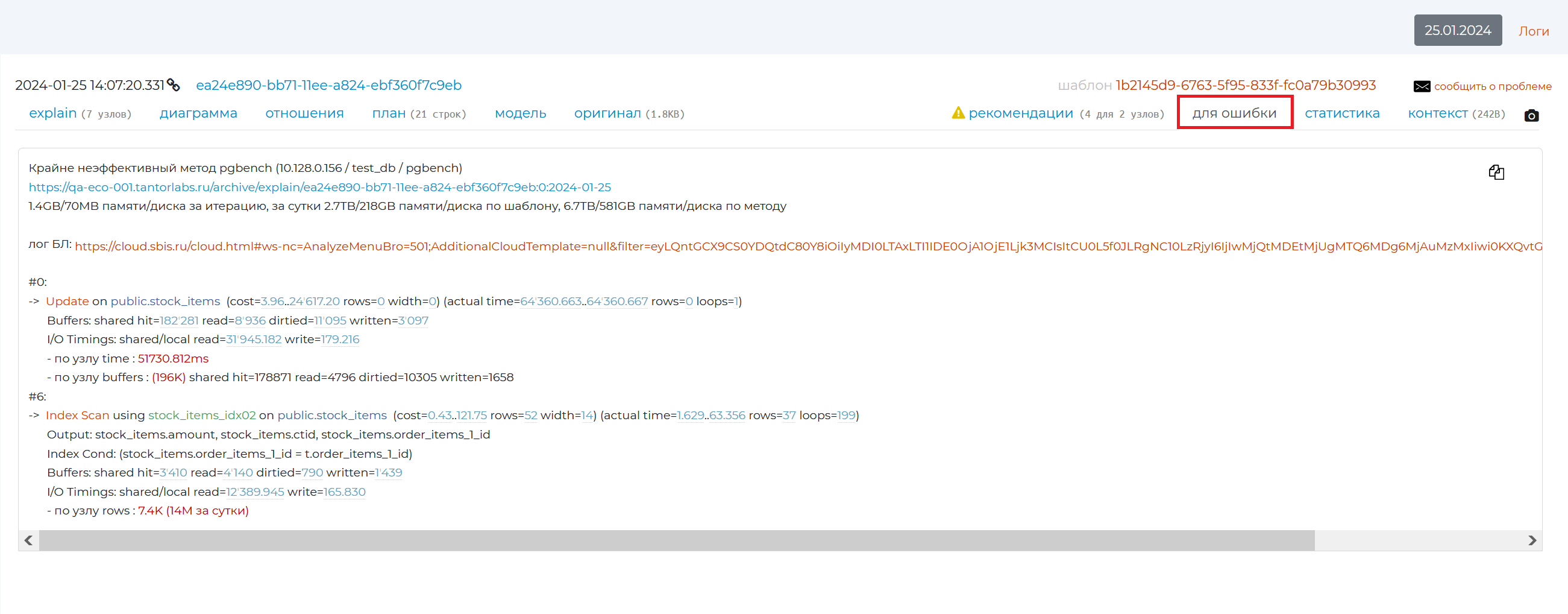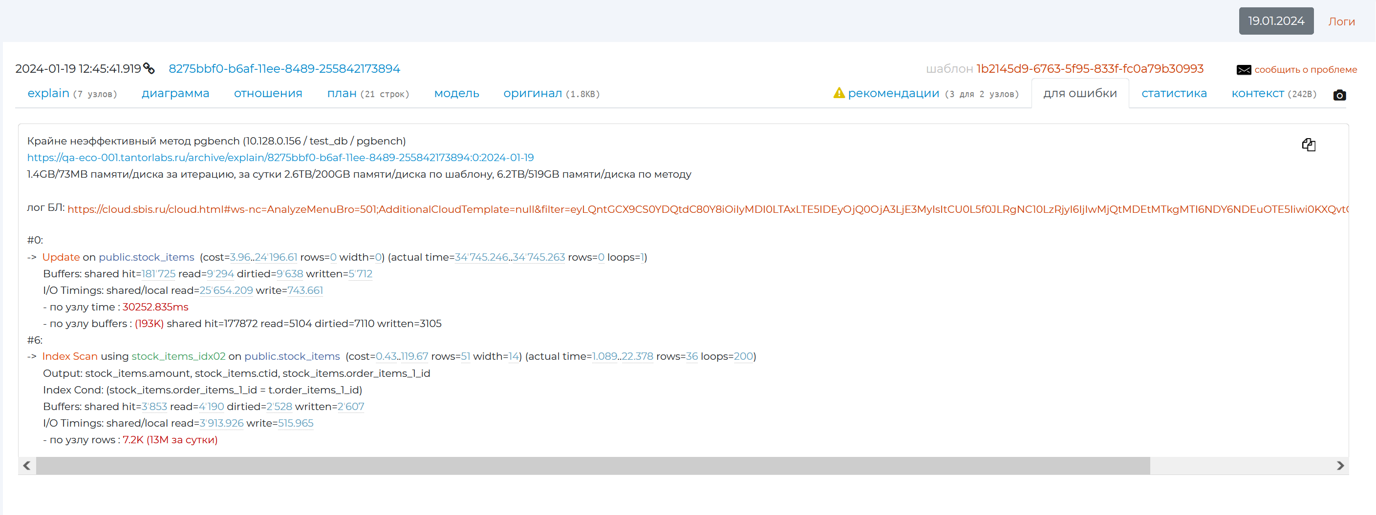 The first line of the error pattern contains the method that used this query. It is followed by a link to the specific plan. Statistics are then written about how much information was read by the query and used on the disc per iteration, per day, per pattern and per method. And at the very bottom, the first 10% of the nodes that created the load are listed. Using the copy icon in the top right corner, you can copy the pattern text for the bug and send it to the developer.