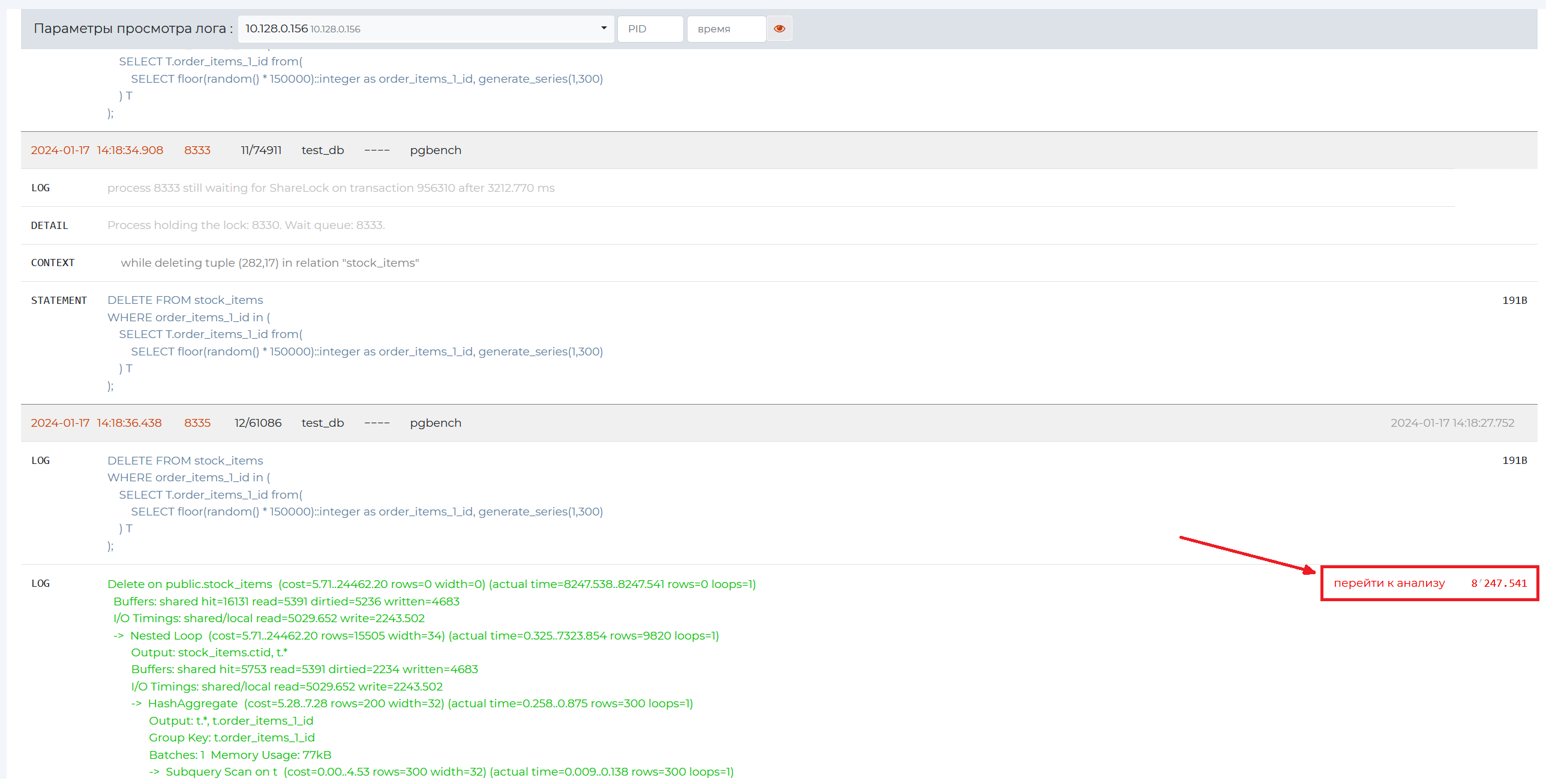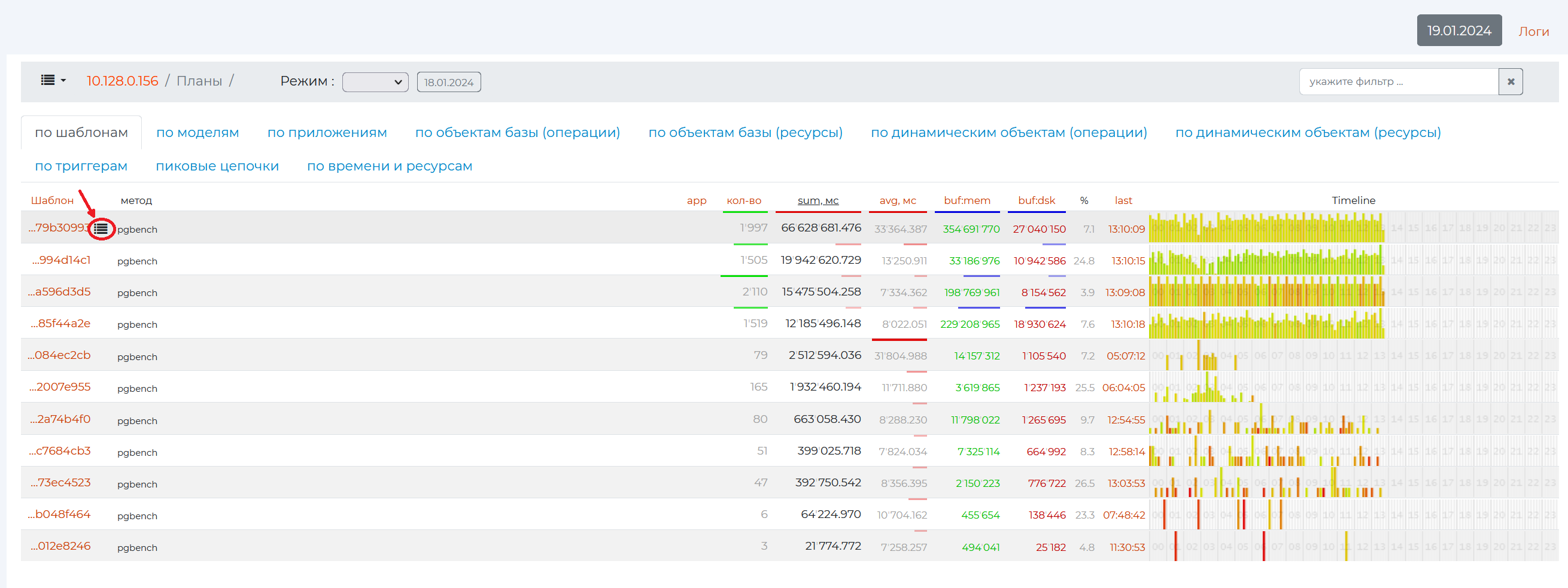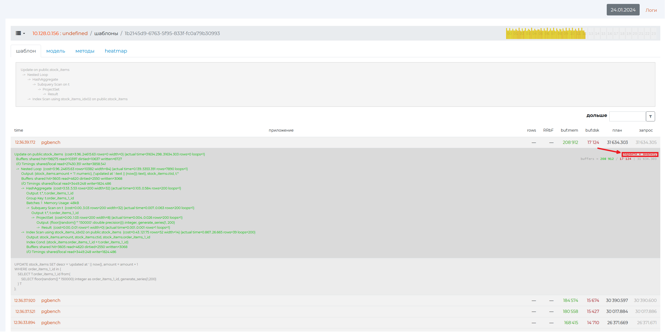 Let’s review the 4 columns that are on the right. They show the result of one of the explain command options, “buffers”. By writing “explain buffers <query_text>” in SQL, you can see the result of this command manually. It shows the type of memory from which the information was read or written, as well as the amount of that information in pages. Normally, each page has 8192 bytes of data if you haven’t changed anything in the configuration. You can check this by writing the query “show block_size”. Thus, these 4 columns carry information on how optimised a given query from the resource usage archive is: