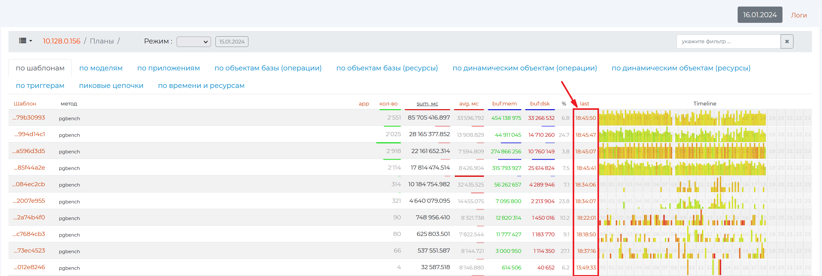 click on the burger menu → “Problematic Queries” and navigate :ref:` to the /Plans <pg_m_Plans>` page → the value in the “last” or “time” column depending on the tab you have open;
