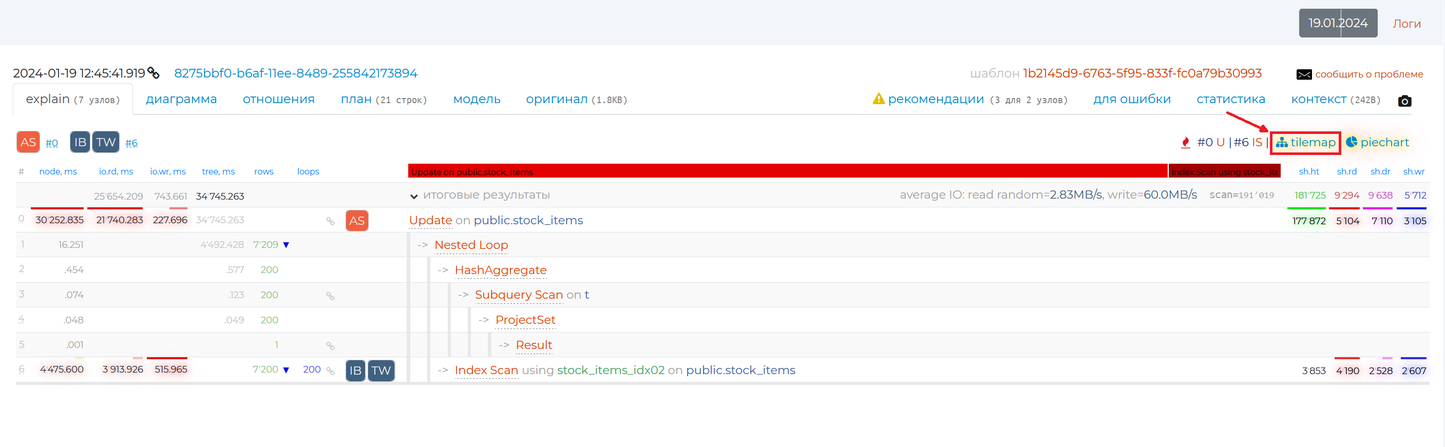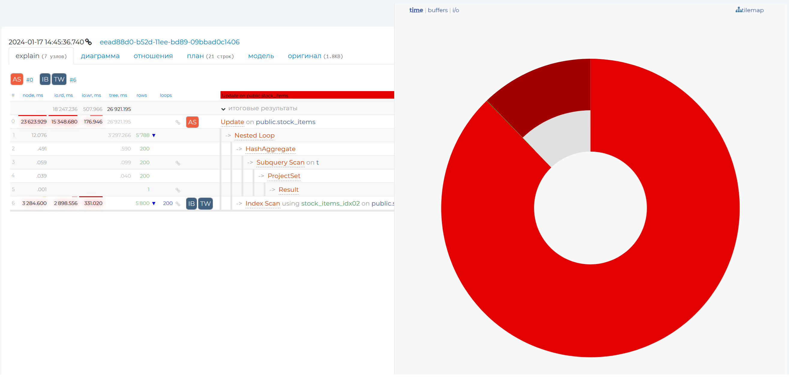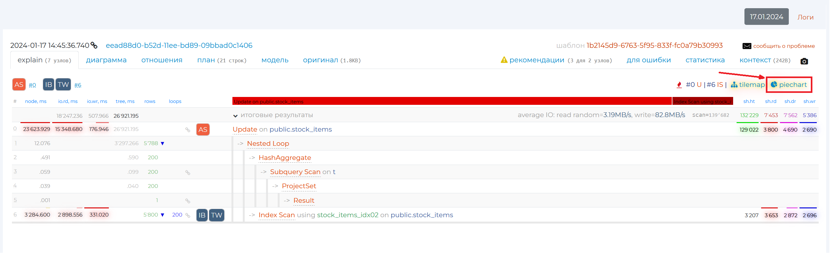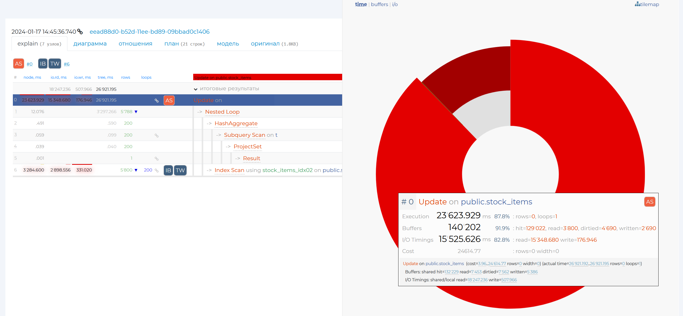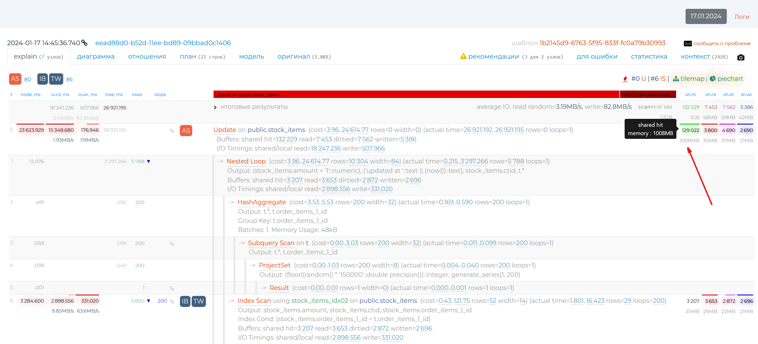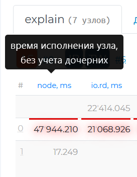 io.rd, ms — result of the explain attribute “track_io_timing”, the time in milliseconds that was spent to read data from the disc. If you move the mouse cursor over the value of this column, a tooltip with the speed of this operation will be displayed.