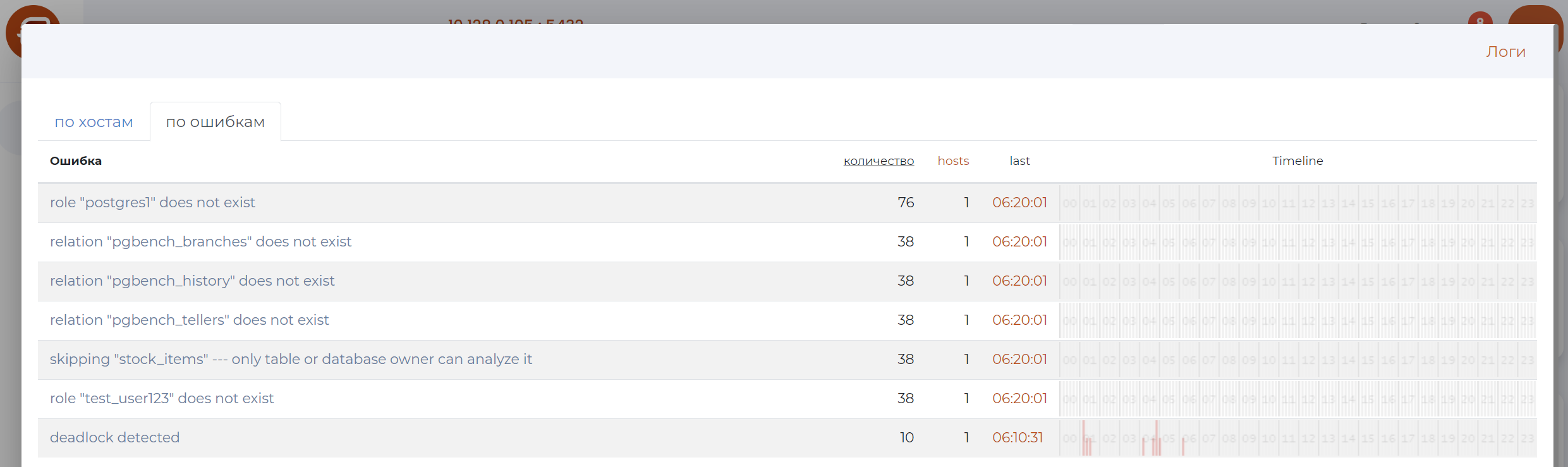 for each host, a timeline chart shows the intensity of problematic queries over a 24-hour period.