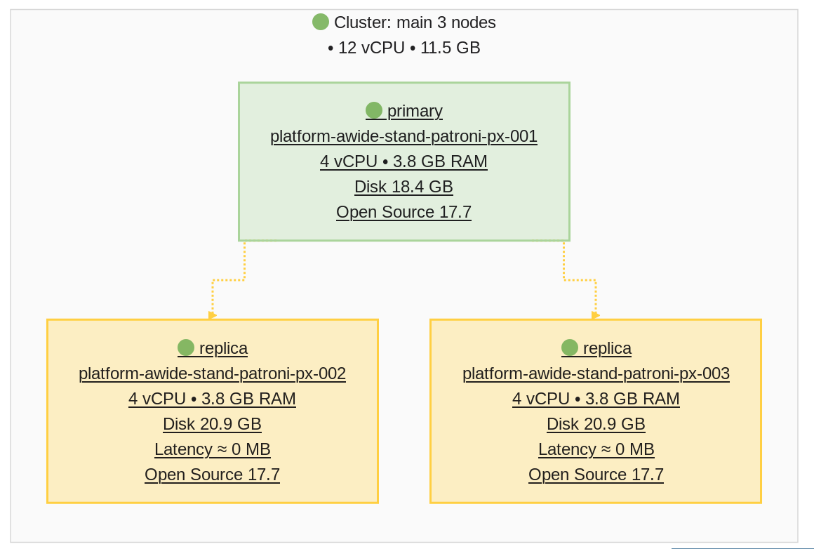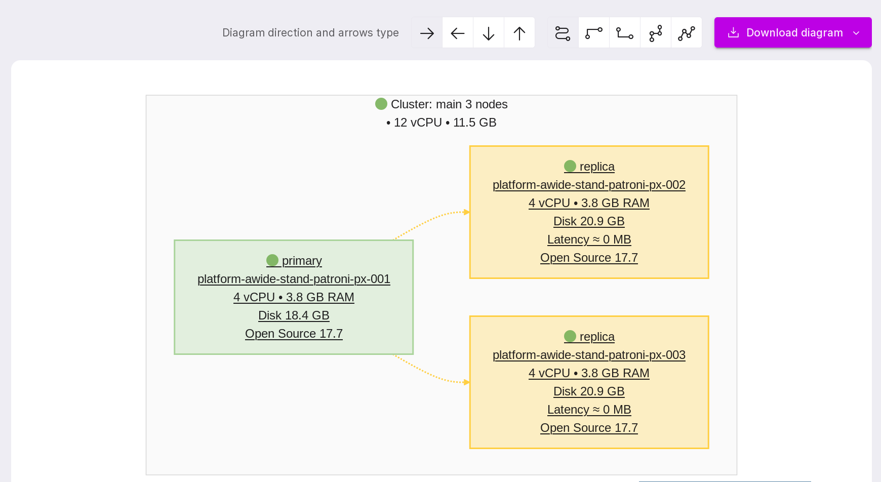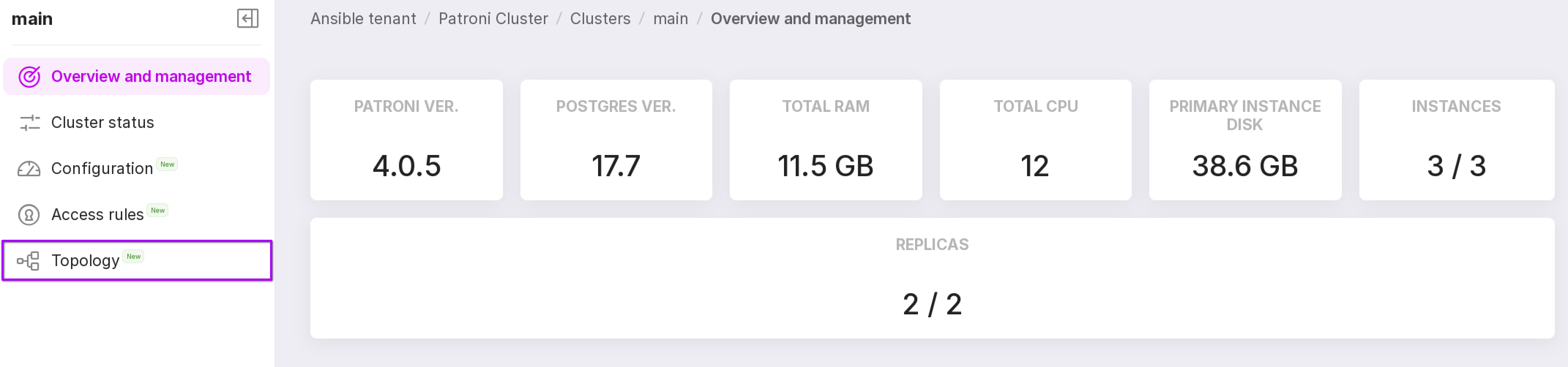 To access this page, go to the “Clusters” tab of your namespace, click the row corresponding to the required cluster, and then select “Topology” from the left-hand menu on the cluster details page.