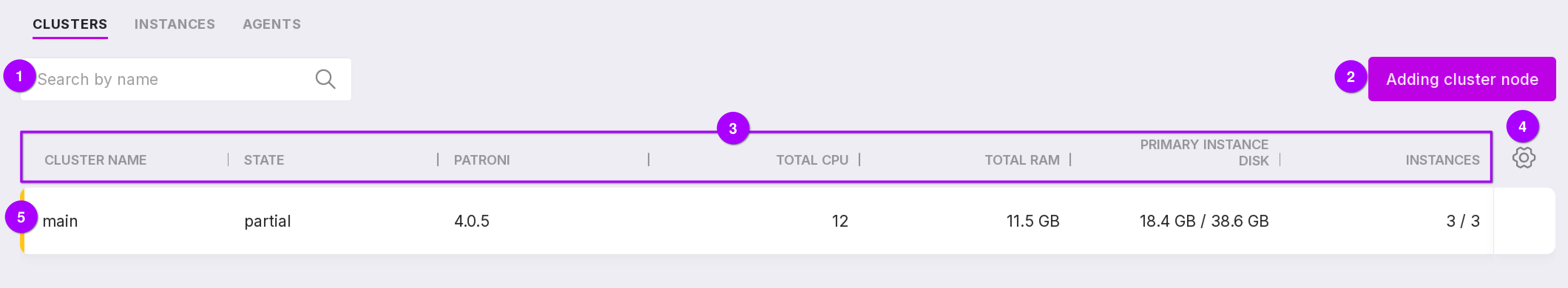 “Search field” — allows you to search for clusters by name.