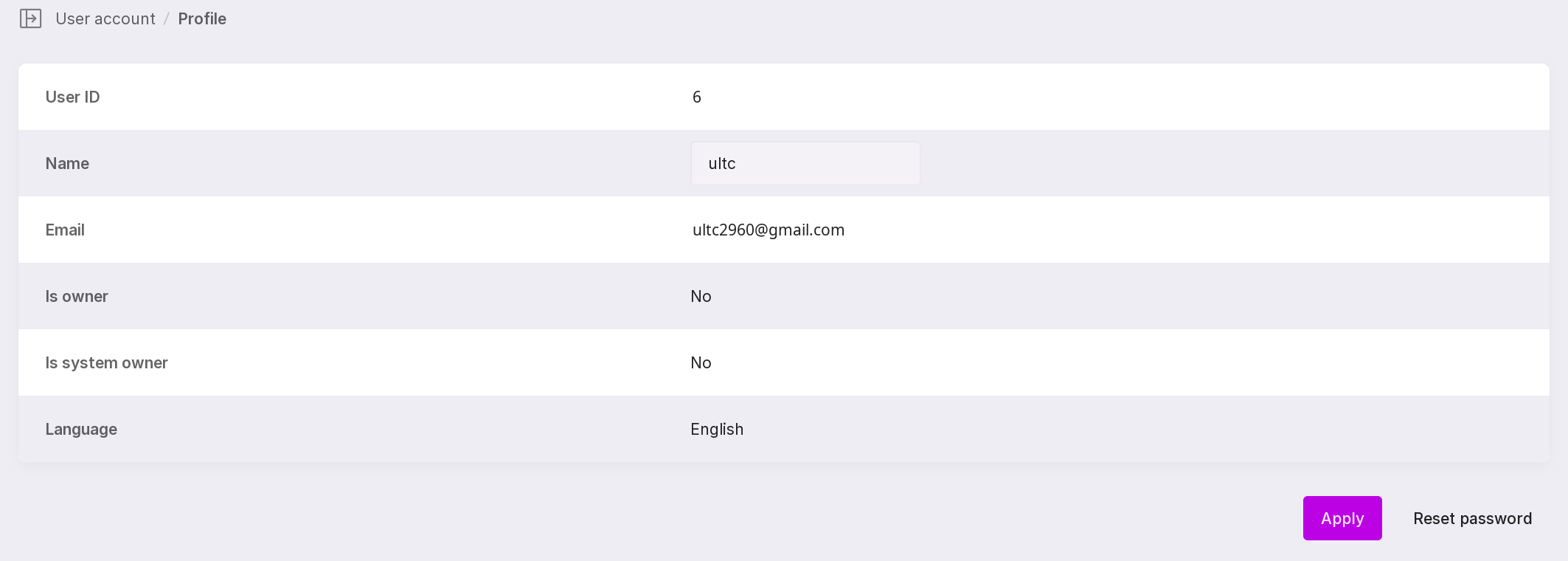 The “Reset password” button changes the user’s password.