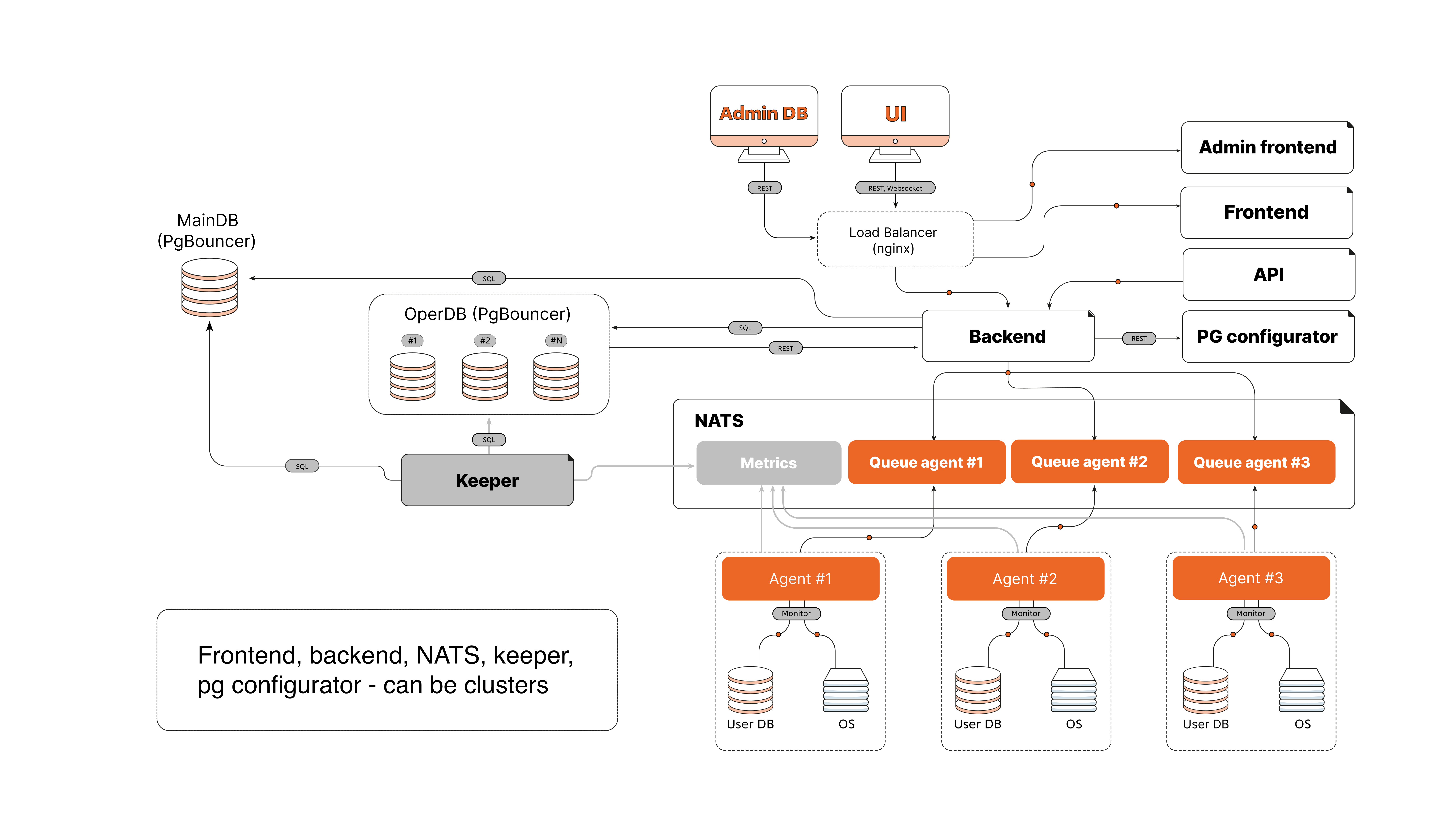 Internal services and databases connect to each other mainly via TCP:4222 (NATS, Flyway, Keeper) and TCP:5432 (pgbouncer, MainDB, OperDB, pg_monitor).