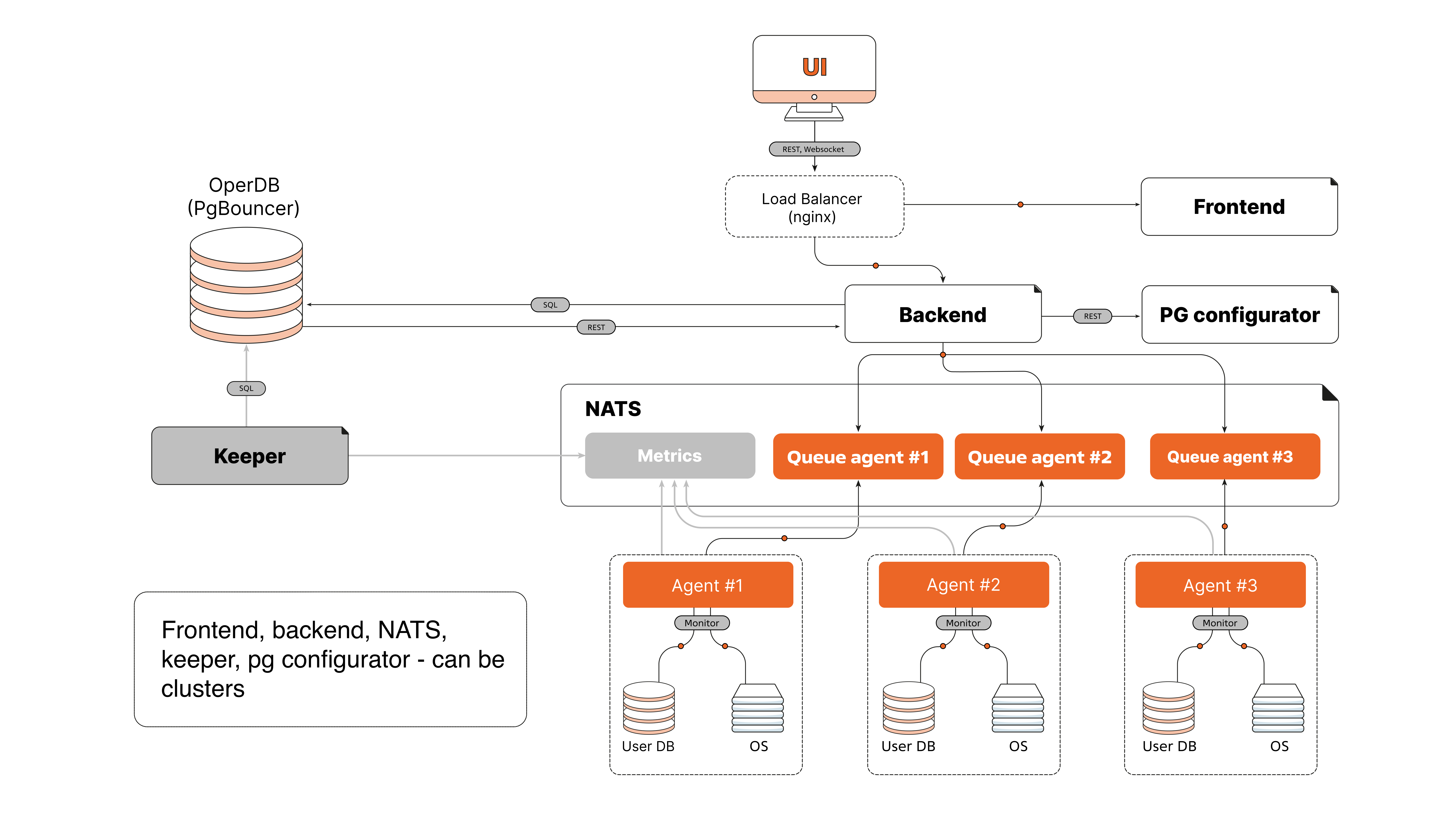 Metrics Collection: Metrics are collected through Agent. The agent monitors the database and operating system. It collects information on metrics from the administered database and sends them through the NATS messaging broker to the backend server. The agent also can send newly changed data based on snapshots and data preaggregation to reduce network traffic and server load.